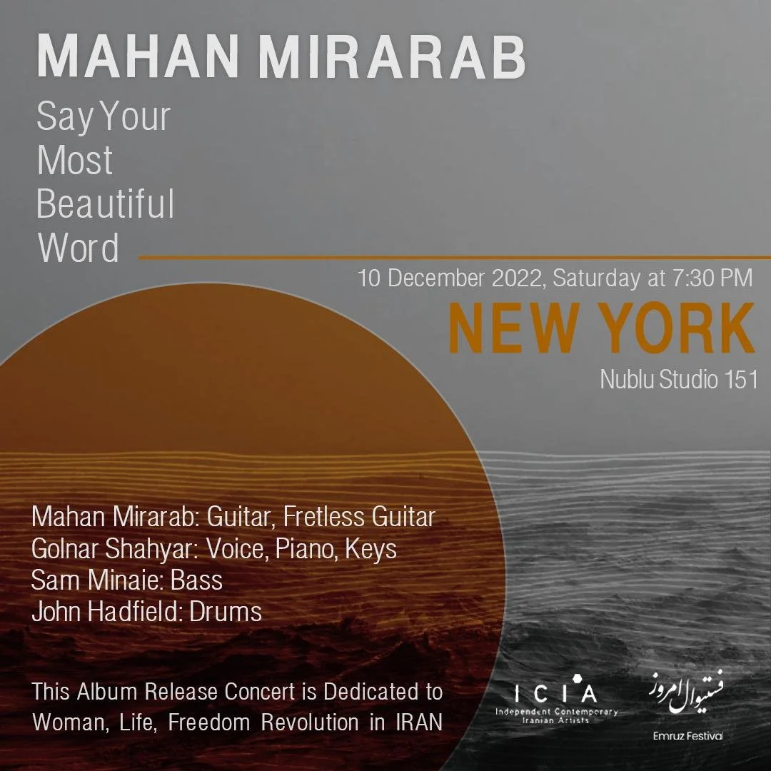 As our community is deeply affected by the feminist revolution that is unraveling in Iran, we felt conflicted about the concert we planned months ago for December 10th: a night with the Mahan Mirarab band. As we contemplated canceling this event, we came to the conclusion that their music and this event could instead be a night of gathering for our community to mourn, protest, express their rage, heal and echo their solidarity with the brave people of Iran. We invite you to come and share the space we are holding together on December 10 with Mahan Mirarab (Guitar, Fretless Guitar), Golnar Shahyar (Voice, Piano, Keys), Sam Minaie (Bass), and John Hadfield (Drums).